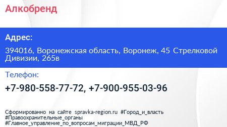 Алкобренд по адресу 394016, Воронежская область, Воронеж, 45 Стрелковой Дивизии, 265в в дальнейшем Организация, размещена в следующих категориях: