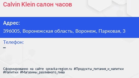 Calvin Klein, салон часов по адресу 396005, Воронежская область, Воронеж, Парковая, 3 в дальнейшем Организация, размещена в следующих категориях: