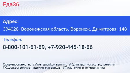 Еда36 по адресу 394028, Воронежская область, Воронеж, Димитрова, 148 в дальнейшем Организация, размещена в следующих категориях: