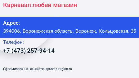 Карнавал любви, магазин по адресу 394006, Воронежская область, Воронеж, Кольцовская, 35 в дальнейшем Организация, размещена в следующих категориях: