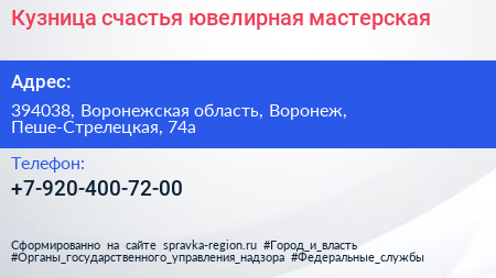 Кузница счастья, ювелирная мастерская по адресу 394038, Воронежская область, Воронеж, Пеше-Стрелецкая, 74а в дальнейшем Организация, размещена в следующих категориях: