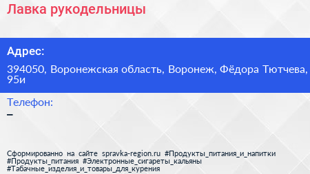 Лавка рукодельницы по адресу 394050, Воронежская область, Воронеж, Фёдора Тютчева, 95и в дальнейшем Организация, размещена в следующих категориях: