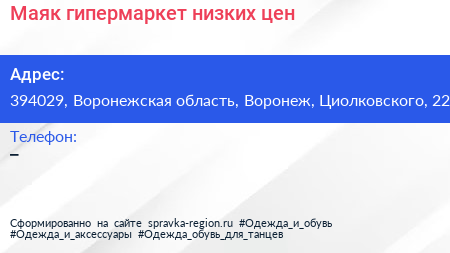 Маяк, гипермаркет низких цен по адресу 394029, Воронежская область, Воронеж, Циолковского, 22 в дальнейшем Организация, размещена в следующих категориях: