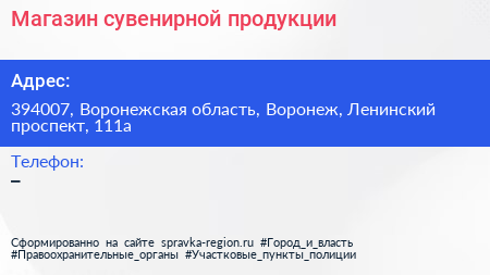 Магазин сувенирной продукции по адресу 394007, Воронежская область, Воронеж, Ленинский проспект, 111а в дальнейшем Организация, размещена в следующих категориях: