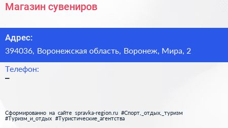 Магазин сувениров по адресу 394036, Воронежская область, Воронеж, Мира, 2 в дальнейшем Организация, размещена в следующих категориях: