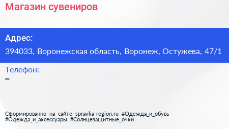 Магазин сувениров по адресу 394033, Воронежская область, Воронеж, Остужева, 47/1 в дальнейшем Организация, размещена в следующих категориях: