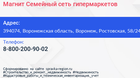 Магнит Семейный, сеть гипермаркетов по адресу 394074, Воронежская область, Воронеж, Ростовская, 58/24 в дальнейшем Организация, размещена в следующих категориях: