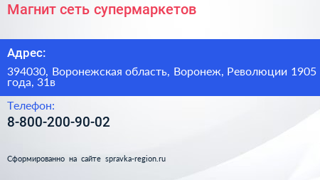 Магнит, сеть супермаркетов по адресу 394030, Воронежская область, Воронеж, Революции 1905 года, 31в в дальнейшем Организация, размещена в следующих категориях: