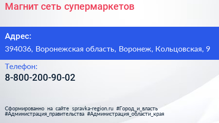 Магнит, сеть супермаркетов по адресу 394036, Воронежская область, Воронеж, Кольцовская, 9 в дальнейшем Организация, размещена в следующих категориях: