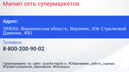 Магнит, сеть супермаркетов по адресу 394056, Воронежская область, Воронеж, 206 Стрелковой Дивизии, 400 в дальнейшем Организация, размещена в следующих категориях: