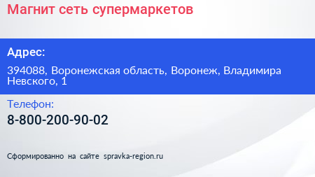 Магнит, сеть супермаркетов по адресу 394088, Воронежская область, Воронеж, Владимира Невского, 1 в дальнейшем Организация, размещена в следующих категориях: