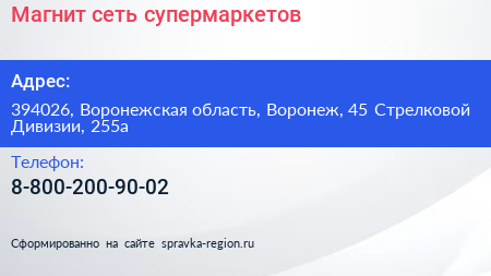 Магнит, сеть супермаркетов по адресу 394026, Воронежская область, Воронеж, 45 Стрелковой Дивизии, 255а в дальнейшем Организация, размещена в следующих категориях: