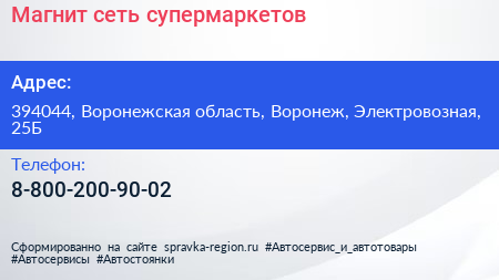 Магнит, сеть супермаркетов по адресу 394044, Воронежская область, Воронеж, Электровозная, 25Б в дальнейшем Организация, размещена в следующих категориях:
