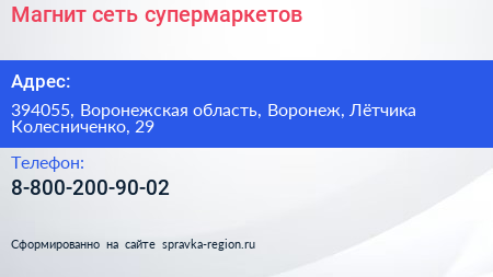 Магнит, сеть супермаркетов по адресу 394055, Воронежская область, Воронеж, Лётчика Колесниченко, 29 в дальнейшем Организация, размещена в следующих категориях: