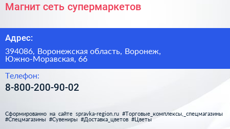 Магнит, сеть супермаркетов по адресу 394086, Воронежская область, Воронеж, Южно-Моравская, 66 в дальнейшем Организация, размещена в следующих категориях: