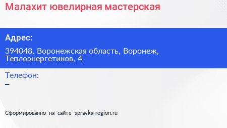Малахит, ювелирная мастерская по адресу 394048, Воронежская область, Воронеж, Теплоэнергетиков, 4 в дальнейшем Организация, размещена в следующих категориях: