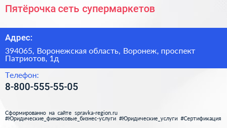 Пятёрочка, сеть супермаркетов по адресу 394065, Воронежская область, Воронеж, проспект Патриотов, 1д в дальнейшем Организация, размещена в следующих категориях: