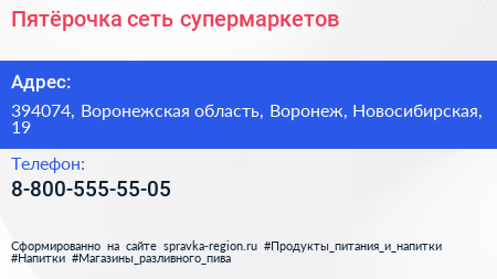 Пятёрочка, сеть супермаркетов по адресу 394074, Воронежская область, Воронеж, Новосибирская, 19 в дальнейшем Организация, размещена в следующих категориях:
