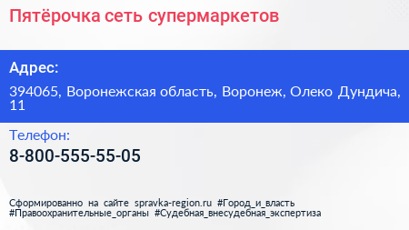 Пятёрочка, сеть супермаркетов по адресу 394065, Воронежская область, Воронеж, Олеко Дундича, 11 в дальнейшем Организация, размещена в следующих категориях:
