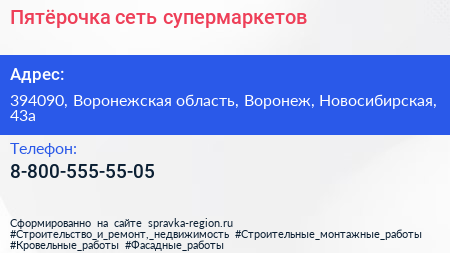 Пятёрочка, сеть супермаркетов по адресу 394090, Воронежская область, Воронеж, Новосибирская, 43а в дальнейшем Организация, размещена в следующих категориях: