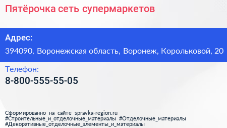 Пятёрочка, сеть супермаркетов по адресу 394090, Воронежская область, Воронеж, Корольковой, 20 в дальнейшем Организация, размещена в следующих категориях: