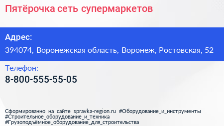 Пятёрочка, сеть супермаркетов по адресу 394074, Воронежская область, Воронеж, Ростовская, 52 в дальнейшем Организация, размещена в следующих категориях: