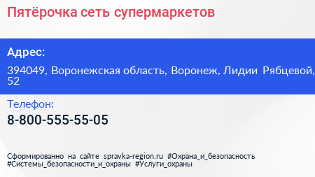 Пятёрочка, сеть супермаркетов по адресу 394049, Воронежская область, Воронеж, Лидии Рябцевой, 52 в дальнейшем Организация, размещена в следующих категориях: