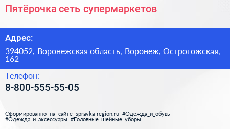 Пятёрочка, сеть супермаркетов по адресу 394052, Воронежская область, Воронеж, Острогожская, 162 в дальнейшем Организация, размещена в следующих категориях: