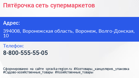 Пятёрочка, сеть супермаркетов по адресу 394008, Воронежская область, Воронеж, Волго-Донская, 10 в дальнейшем Организация, размещена в следующих категориях: