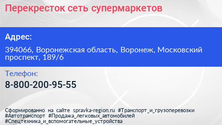 Перекресток, сеть супермаркетов по адресу 394066, Воронежская область, Воронеж, Московский проспект, 189/6 в дальнейшем Организация, размещена в следующих категориях: