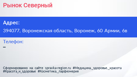 Рынок Северный по адресу 394077, Воронежская область, Воронеж, 60 Армии, 6в в дальнейшем Организация, размещена в следующих категориях: