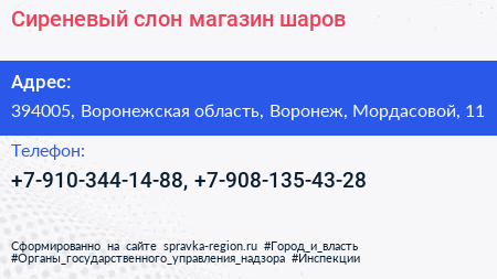 Сиреневый слон, магазин шаров по адресу 394005, Воронежская область, Воронеж, Мордасовой, 11 в дальнейшем Организация, размещена в следующих категориях: