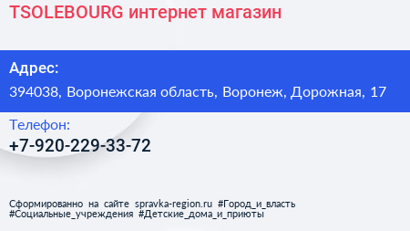 TSOLEBOURG, интернет-магазин по адресу 394038, Воронежская область, Воронеж, Дорожная, 17 в дальнейшем Организация, размещена в следующих категориях: