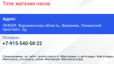 Time, магазин часов по адресу 394029, Воронежская область, Воронеж, Ленинский проспект, 1д в дальнейшем Организация, размещена в следующих категориях: