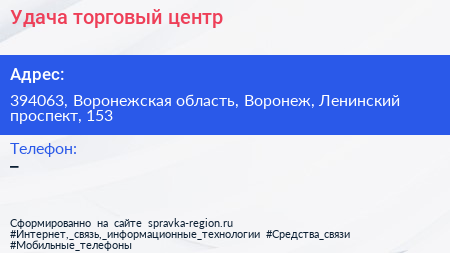 Удача, торговый центр по адресу 394063, Воронежская область, Воронеж, Ленинский проспект, 153 в дальнейшем Организация, размещена в следующих категориях: