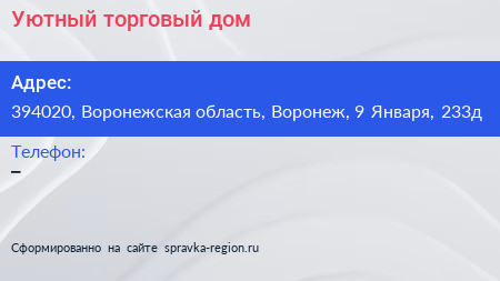 Уютный, торговый дом по адресу 394020, Воронежская область, Воронеж, 9 Января, 233д в дальнейшем Организация, размещена в следующих категориях: