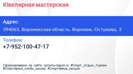 Ювелирная мастерская по адресу 394063, Воронежская область, Воронеж, Остужева, 3 в дальнейшем Организация, размещена в следующих категориях: