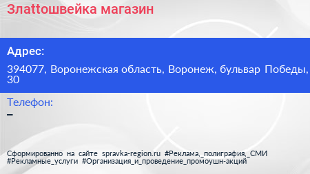 Злаttошвейка, магазин по адресу 394077, Воронежская область, Воронеж, бульвар Победы, 30 в дальнейшем Организация, размещена в следующих категориях: