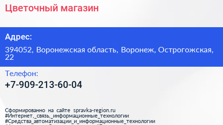 Цветочный магазин по адресу 394052, Воронежская область, Воронеж, Острогожская, 22 в дальнейшем Организация, размещена в следующих категориях: