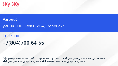 «Жу-Жу» по адресу улица Шишкова, 70А, Воронеж в дальнейшем Организация, размещена в следующих категориях: