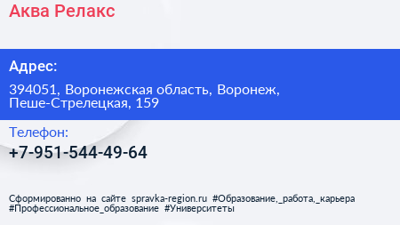 Аква Релакс по адресу 394051, Воронежская область, Воронеж, Пеше-Стрелецкая, 159 в дальнейшем Организация, размещена в следующих категориях:
