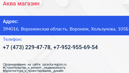 Аква, магазин по адресу 394016, Воронежская область, Воронеж, Хользунова, 105Б в дальнейшем Организация, размещена в следующих категориях: