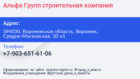 Альфа Групп, строительная компания по адресу 394030, Воронежская область, Воронеж, Средне-Московская, 30 к1 в дальнейшем Организация, размещена в следующих категориях: