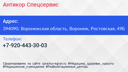 Антикор-Спецсервис по адресу 394090, Воронежская область, Воронеж, Ростовская, 49Б в дальнейшем Организация, размещена в следующих категориях: