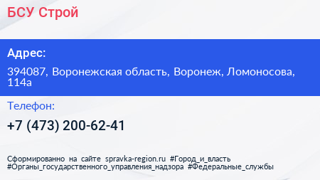 БСУ-Строй по адресу 394087, Воронежская область, Воронеж, Ломоносова, 114а в дальнейшем Организация, размещена в следующих категориях: