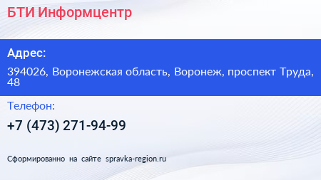 БТИ - Информцентр по адресу 394026, Воронежская область, Воронеж, проспект Труда, 48 в дальнейшем Организация, размещена в следующих категориях: