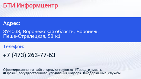 БТИ - Информцентр по адресу 394038, Воронежская область, Воронеж, Пеше-Стрелецкая, 58 к1 в дальнейшем Организация, размещена в следующих категориях: