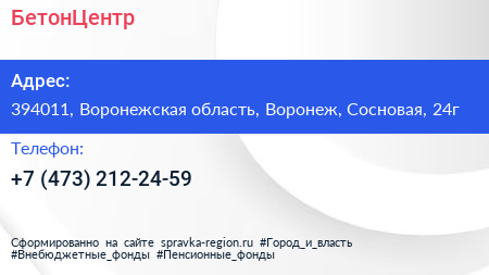 БетонЦентр по адресу 394011, Воронежская область, Воронеж, Сосновая, 24г в дальнейшем Организация, размещена в следующих категориях: