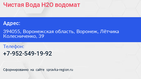 Чистая Вода H2O, водомат по адресу 394055, Воронежская область, Воронеж, Лётчика Колесниченко, 39 в дальнейшем Организация, размещена в следующих категориях: