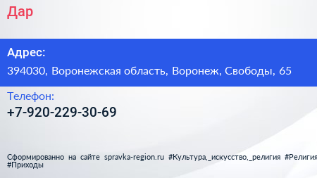 Дар по адресу 394030, Воронежская область, Воронеж, Свободы, 65 в дальнейшем Организация, размещена в следующих категориях: